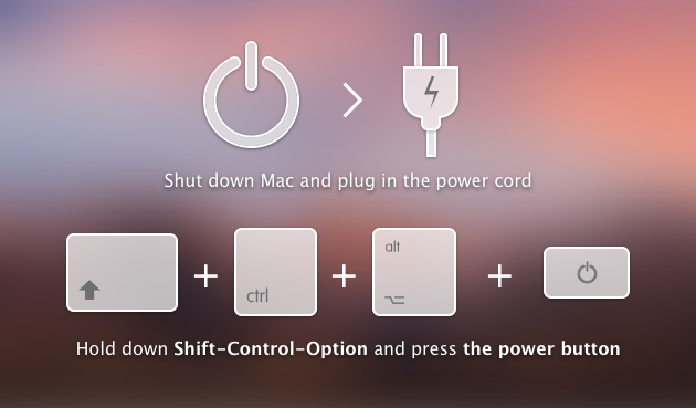 - Press Shift-Control-Option and a power button at the same time and hold for 10 seconds.